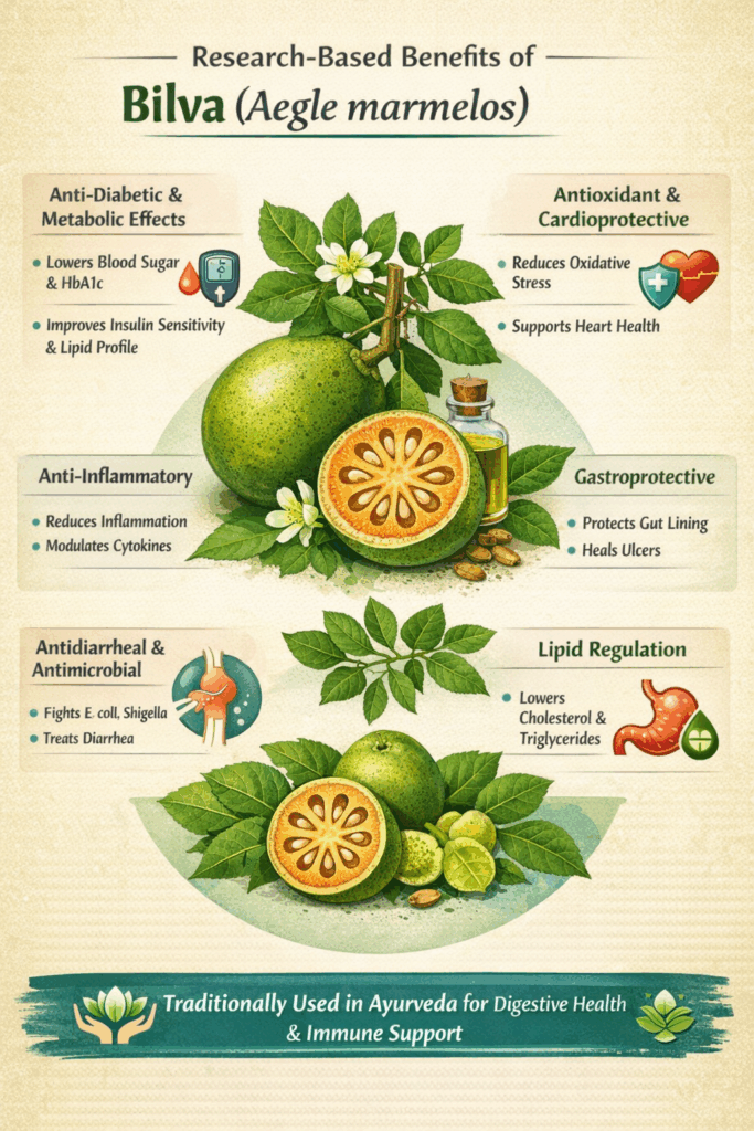 Bilva (Aegle marmelos) is a multifunctional Ayurvedic herb with systemic benefits spanning digestive, respiratory, circulatory, excretory, reproductive, and nervous systems. Supported by classical Ayurvedic texts and modern observations, it remains an effective and safe remedy when used correctly. Consultation with an Ayurvedic practitioner ensures optimal results.