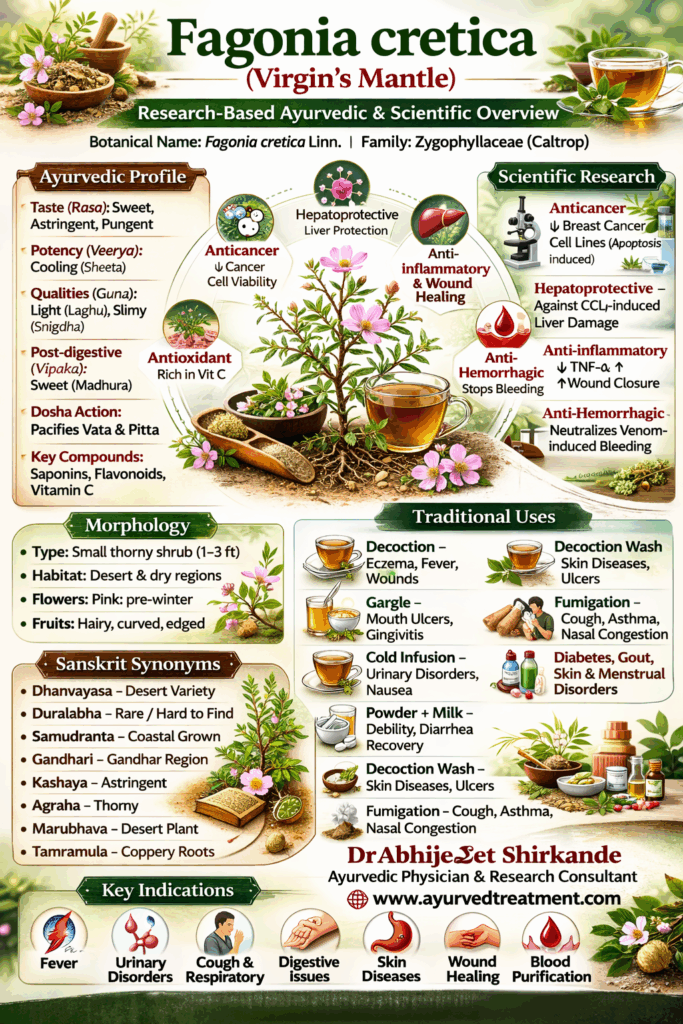 Fagonia cretica (Dhanvayasa / Duralabha) is a classical desert herb with multidimensional therapeutic applications. Its cooling potency, astringent character, and Vata-Pitta pacifying action make it valuable in inflammatory, febrile, respiratory, urinary, and dermatological conditions. Contemporary research findings further validate several traditional claims, highlighting its relevance in integrative medicine.