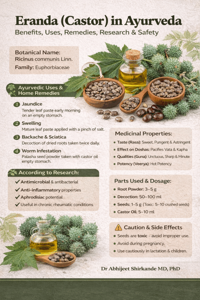 Eranda is a powerful Ayurvedic drug with wide therapeutic applications, especially in Vata disorders, pain conditions, and bowel regulation. However, due to the toxicity of its seeds and strong purgative nature, it should always be used judiciously and preferably under the supervision of a qualified Ayurvedic physician.