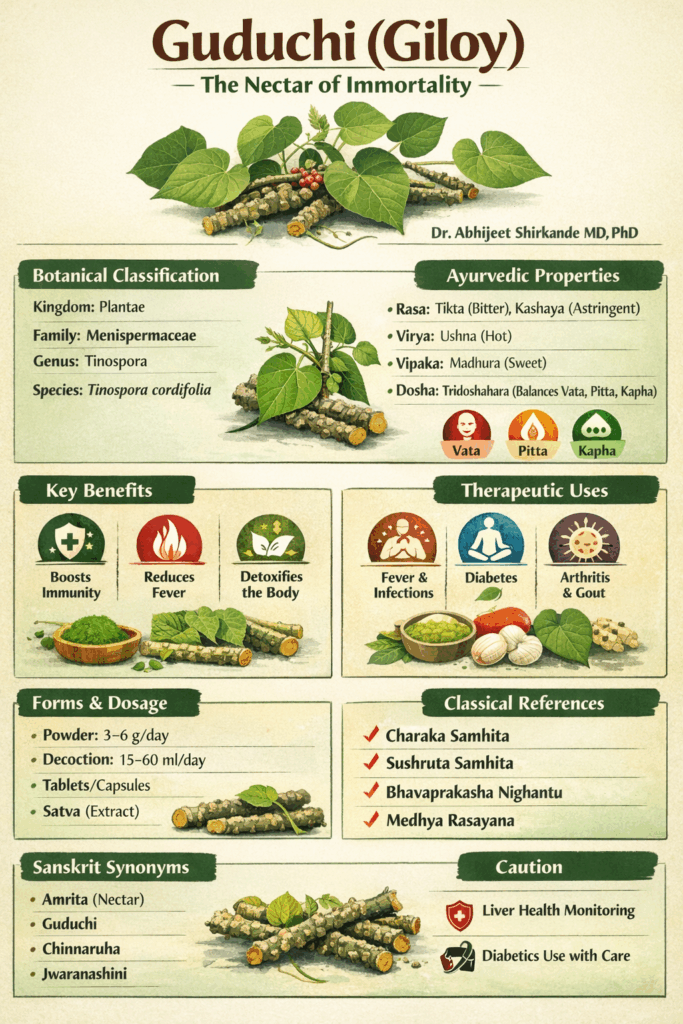 Guduchi stands as one of Ayurveda’s most powerful and versatile medicinal plants. Its ability to balance all three Doshas, strengthen immunity, correct metabolism, and rejuvenate tissues makes it invaluable in both preventive and therapeutic healthcare. When used judiciously under proper guidance, Guduchi truly lives up to its name—Amrita, the nectar of life.