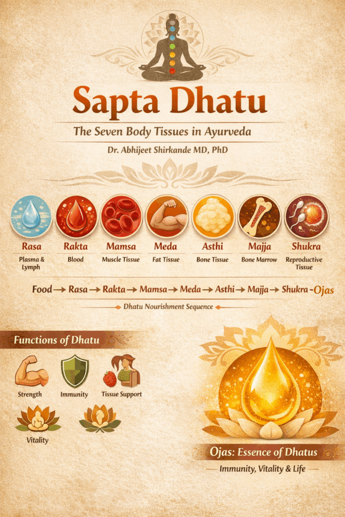 The word Dhatu originates from the Sanskrit root “Dhru”, which means to support, sustain, or maintain. Therefore, Dhatus are the tissues that support the body both structurally and functionally.