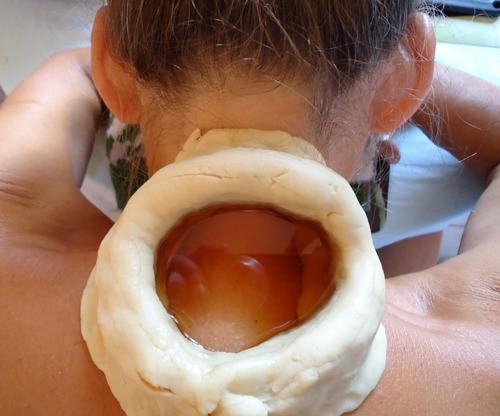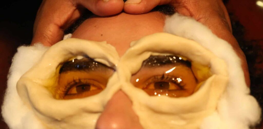 The medicated ghee is poured over the eyelids in an enclosure built around the eye out of wheat flour. It is said to be an excellent treatment to improve vision and clarity of the mind. This treatment aims to provide optimum rejuvenation to eyes. Dough of Urad (black gram) is put around the eye ball in such a way that a dam like appearance is seen. Then herbal healing ghee (clarified butter) is put in this groove to lubricate the eye and surrounding areas which will be kept warm for 30 – 35 minutes. This provides improved vision with beautiful eyes and strengthening of eye tissues